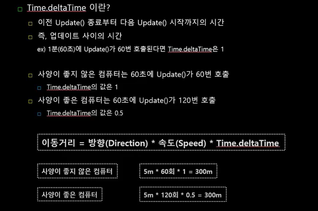 방향 값이 1 단위이고 Time.deltaTime가 곱해져 있다면, 속도 값이 1초에 움직이는 거리와 동일하게 설정된다.
