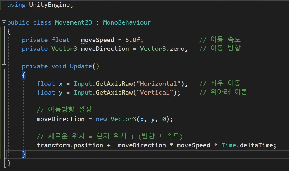 // 새로운 위치 = 현재 위치 + (방향 * 속도)