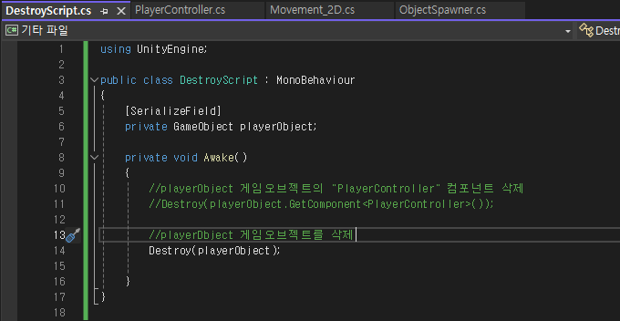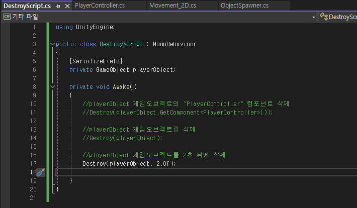 Destroy 함수의 매개변수에 게임 오브젝트를 등록하게 되면 게임 오브젝트가 삭제되는 것을 확인할 수 있다.