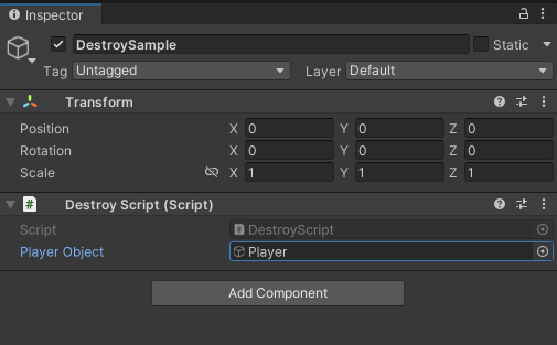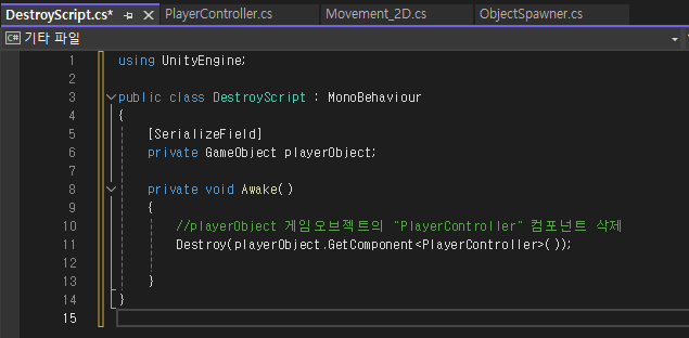 빈 오브젝트를 생성해서 위의 DestroyScript 코드를 컴포넌트에 추가하고 Player Object 변수에 플레이어를 등록한다. 실행하면 플레이어 컴포넌트의 controller가 사라진 것을 확인할 수 있다.