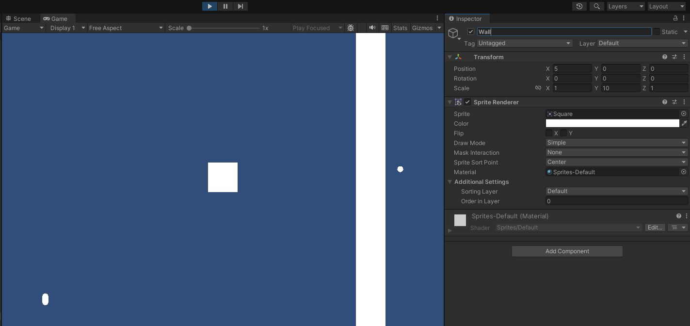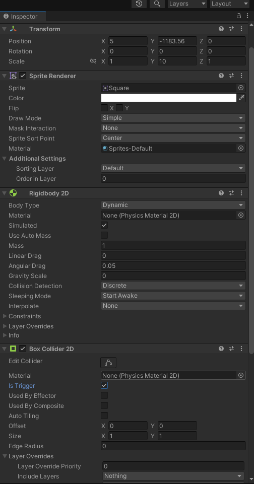 장애물로 사용할 벽 오브젝트를 새로 생성한다. 이 오브젝트는 충돌이 가능하기 때문에 Rigidbody 2D의 gravity scale을 0으로 설정하고, Box Collider 2D 추가해 is trigger을 설정해준다.
