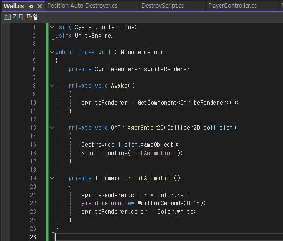 스크립트는 다음과 같이 작성하였고 wall 오브젝트에 추가한다. 총알을 맞으면 벽이 빨갛게 변한다.