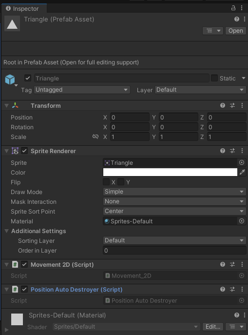 위의 스크립트를 각각 box, circle, triangle 에 컴포넌트로 적용한다.이후 실행하면 화면 밖으로 벗어나면 사라지는 것을 확인할 수 있다.