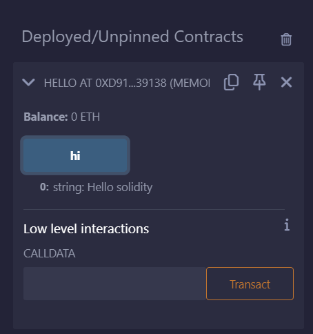 Deploy를 누르면 hello라는 컨트랙트에 hi 변수에 "Hello solidity"가 출력되는 컨트랙트가 배포되는 것을 확인할 수 있다.
