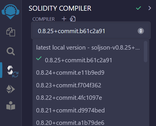 코드 컴파일을 위해 컴파일 버전을 선택해야한다. 컴파일 버전 중 제일 높은 버전인 0.8.25 버전을 사용하도록 하겠다. 이후 컴파일을 진행한다.