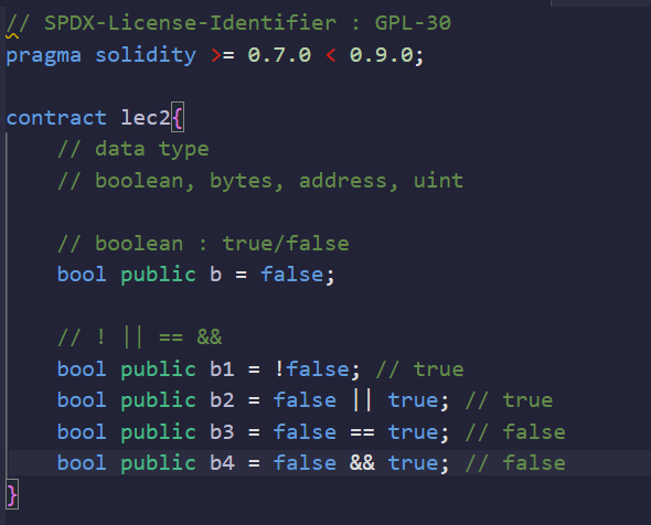 boolean은 true와 false 두 값을 가지며, 데이터 타입을 먼저 선언하고, 접근 제한자와 변수명을 작성한다. boolean의 경우 다른 언와 마찬가지로 논리 연산자를 사용한다.