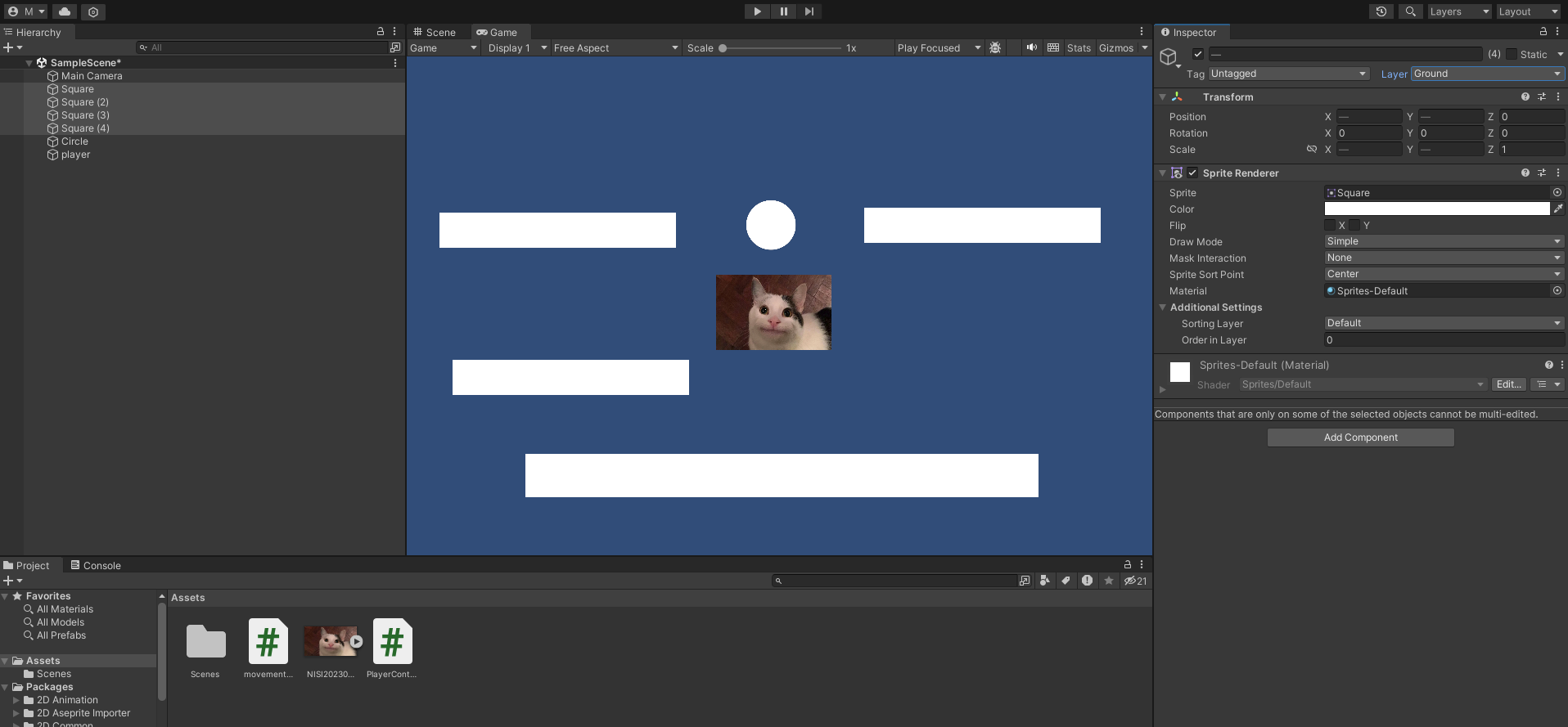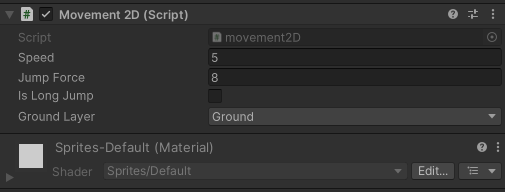땅으로 사용되는 모든 오브젝트의 layer 값을 Ground로 바꿔주고, 플레이어 오브젝트에도 Ground Layer 변수를 Ground로 설정한다. Movement2D에 게임을 실행하면, 땅에 닿아야지 점프가 되는 것을 확인할 수 있다.