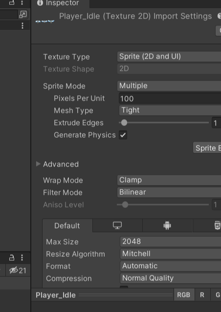 플레이어 오브젝트를 생성하고 사용할 이미지를 넣어준 후, Sprite 모드를 Multiple로 설정한다.