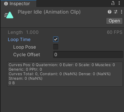 프로젝트 뷰에서 애니메이션 오브젝트를 생성한 뒤, loop type은 반복 재생을 할지에 대한 여부를 선택할 수 있어서 체크하여 반복재생하도록 설정한다,