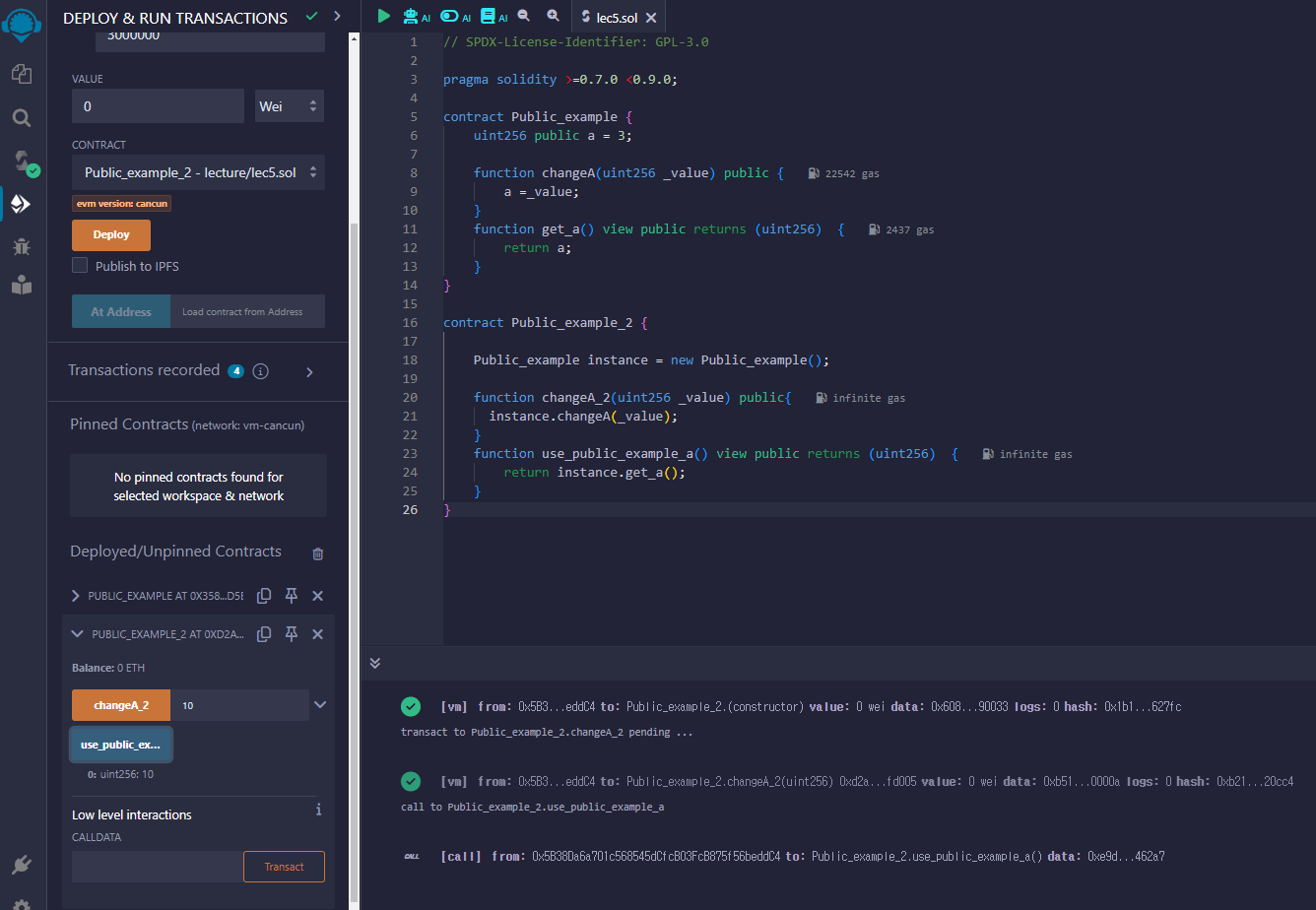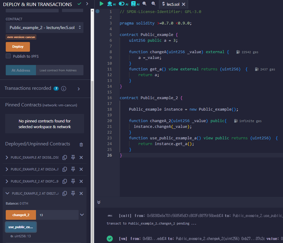 Public_example 과 Public_example_2 라는 두개의 스마트 컨트랙을 만든다. Public_example 스마트 컨트랙안에는 changeA와 get_a 함수가 있는데 get_a 함수에 들어가 있는 view는 pure와 같이 다음 강의에서 다룰 예정이다.