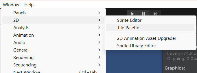 Tilemap palette 생성 편집은 Tile palette view에서 할 수 있으며, window > 2D > Tile Palette 를 통해서 메뉴를 열 수 있다.