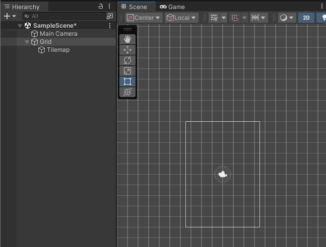 Tile Asset 배치를 위해 GameObject > 2D Object > Tilemap 생성한다. 생성하면 Grid game object와 자식으로 tilemap object가 배치된 것을 확인할 수 있다.