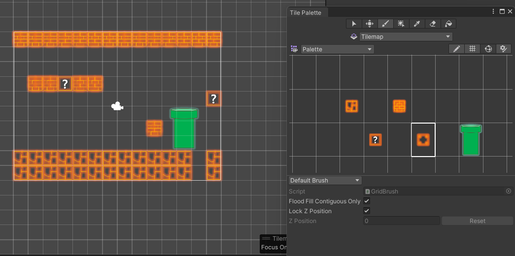 Tile Asset을 배치하는 공간으로 실제 게임에 보여지는 타일 형태의 케임 월드로 Grid object의 자식으로 여러 개의 Tilemap 오브젝트들의 등록이 가능하다. 레이어를 구분해서 진행
