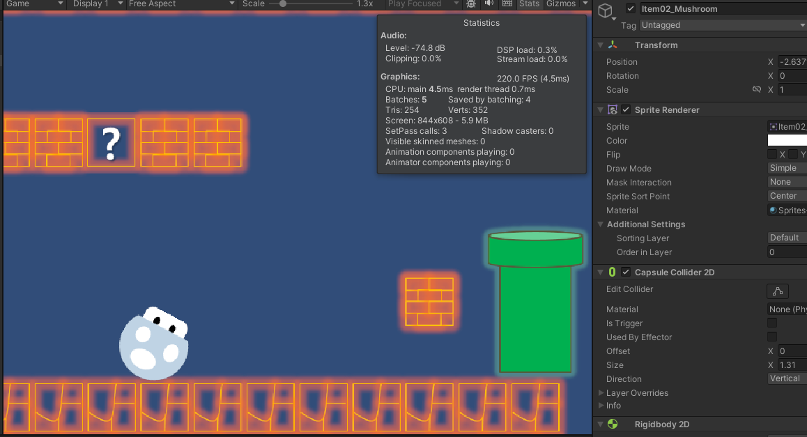 충돌처리가 잘 적용되었는지 확인을 위해 오브젝트를 하나 생성해서 capsule collider 2D 컴포넌트와 rigidbody 2D 컴포넌트를 추가해주었다. 충돌처리가 잘 되는 것을 확인할 수 있다.