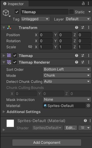 현재 타일맵 오브젝트가 화면에 그려지는 방법에 대해 설정할 수 있다. (meterial, 정렬 기준, 정렬 순서 등)