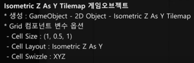 Isometric Z As Y Tilemap은 기존의 Isometric과 동일하게 보여지지만 높이를 설정할 때 유용하게 활용할 수 있다.