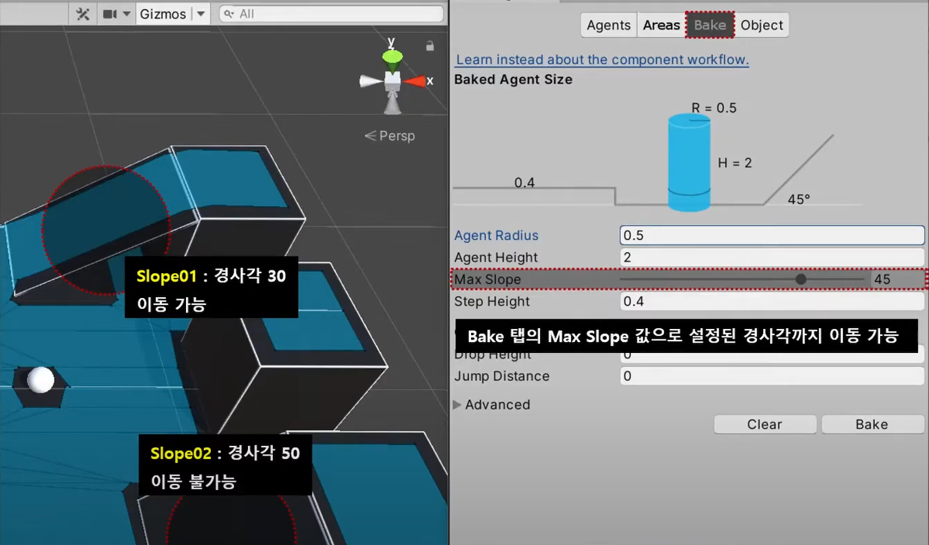 - Max Slope : 에이전트가 올라갈 수 있는 경사 각도