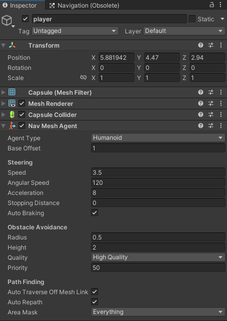 player 오브젝트에 NavMeshAgent 컴포넌트를 등록한다.
