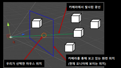 - 오브젝트에 부딪혀 멈추게 되면 부딪힌 오브젝트의 정보를 반환한다.(광선에 부딪혔다 = 마우스로 선택한 오브젝트이다.)