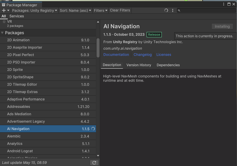 현재 2022.3..22f1 버전에서 Navigation View는 보이지 않기 때문에 강의와는 다르게 다운을 받아야 한다. Window > Package Manager > Unity Registry > AI Navigation 들어가서 AI Navigation 을 설치한다.