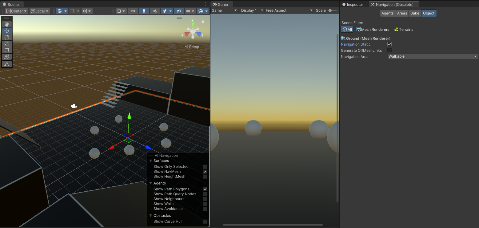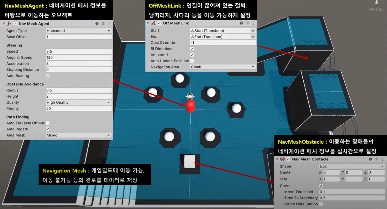 이를 위해 게임 월드에 Navigation Mesh를 설정하고 이동 에이전트에게 NavMeshAgent 컴포넌트를 기반으로 이동하도록 한다. 또한 offMeshLink 나 NavMeshObstacle 컴포넌트도 사용한다.