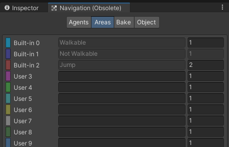 구역 이름으로 기본으로 Walkable(이동 가능), Not Walkable(이동 불가능), Jump(뛰기)가 제공되고, User 3부터 원하는 구역을 추가로 설정할 수 있다.