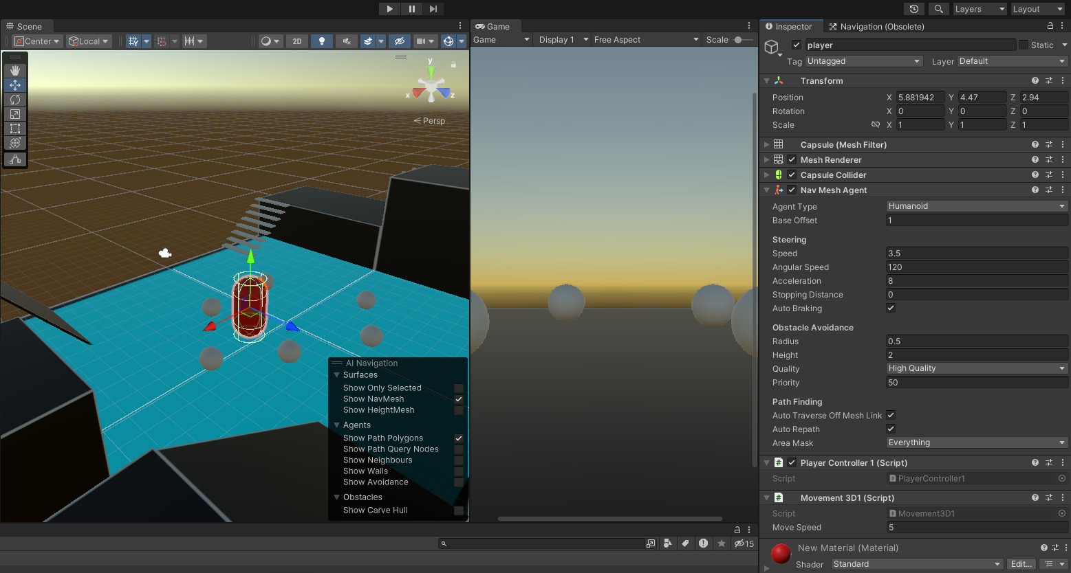 또한 맵에 새로운 바닥 혹은 장애물을 배치했다면 Navigation Static 설정과 Bake를 다시 진행해야한다.