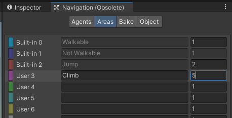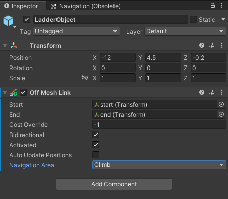 LadderObject의 Off Mesh Link 컴포넌트의 Navigation Area 변수를 climb로 설정한다.