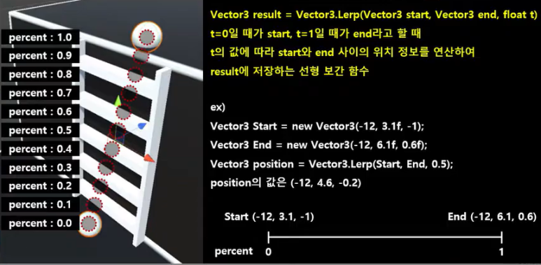 // 시간 경과(최대 1)에 따라 오브젝트의 위치를 바꿔준다