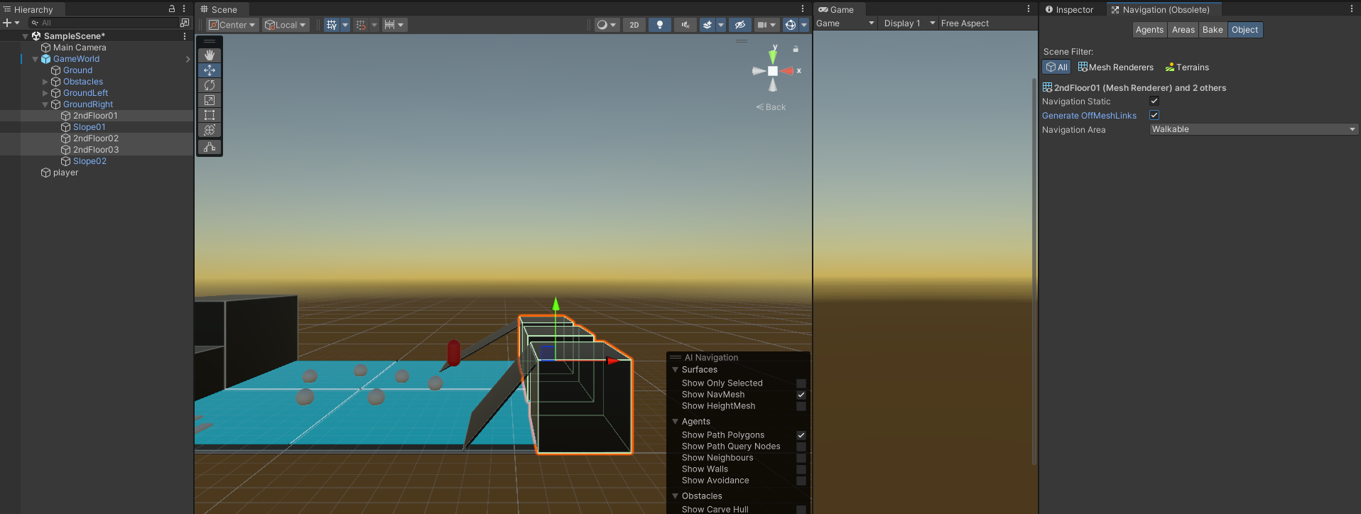 - Off MEsh Link로 연결되는 두 지점으로 사용할 게임 오브젝트 생성 (※ 게임 오브젝트 위치가 Navigation Mesh의 이동 경로 내에 포함되어야 정상적인 이동 가능)