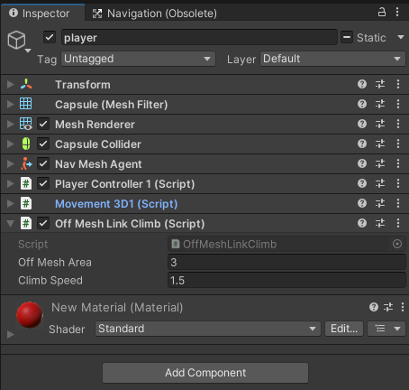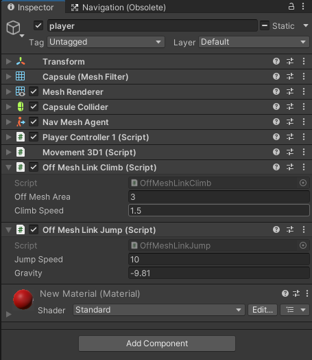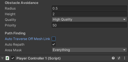 Player 오브젝트에 NevMeshAgent 컴포넌트에 있는 Auto Traverse Off Mesh Link가 체크 해제되어 있으면 Off Mesh Link를 만나면 오브젝트가 멈추게 된다.