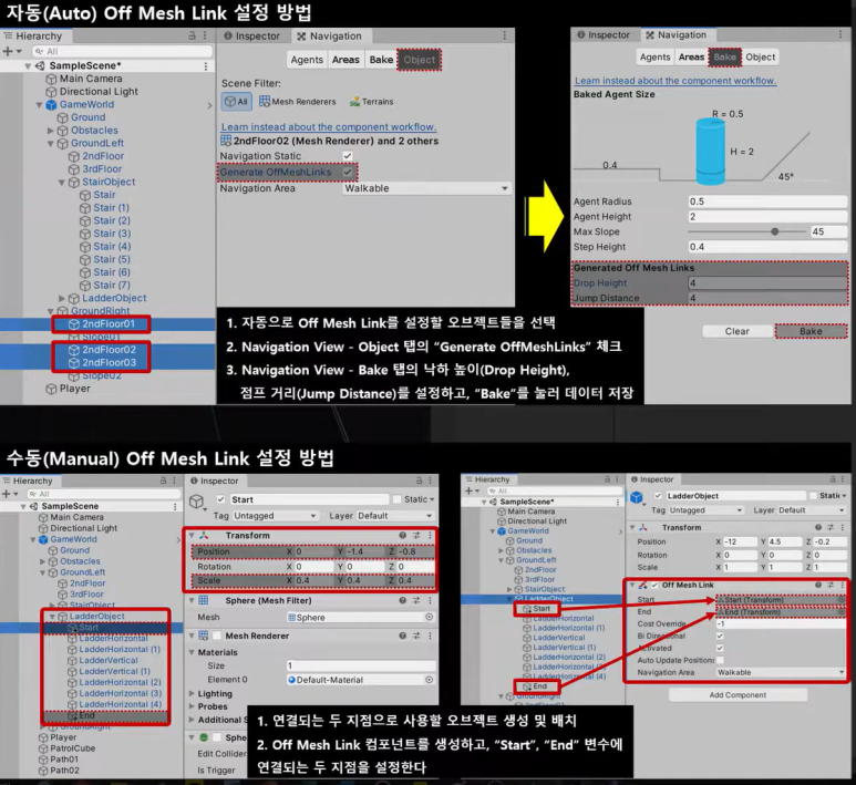- Navigation View > Object tab > Generate OffMeshLinks 체크