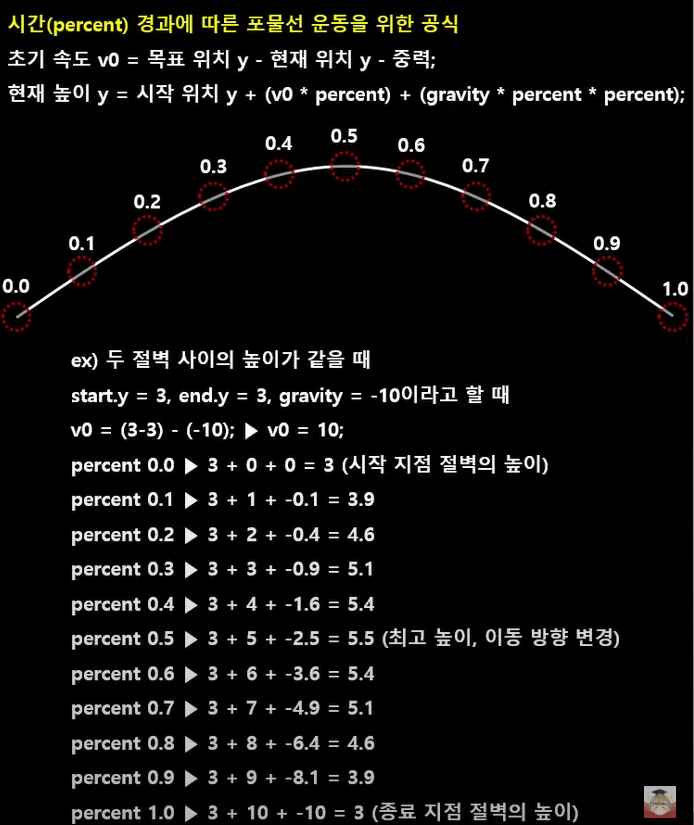 // 포물선 운동 : 시작위치 + 초기속도*시간 + 중력*시간제곱
