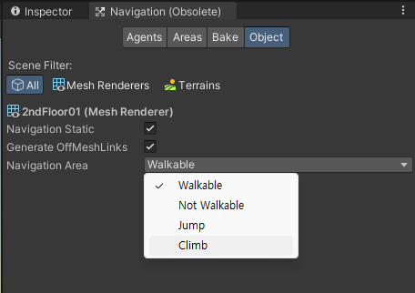 Off Mesh Link 컴포넌트를 가지고 있지 않은 일반 오브젝트의 경우에는 게임오브젝트 선택 후 Navigation View > Object tab > Navigation Area 변수 설정으로 할 수 있다.