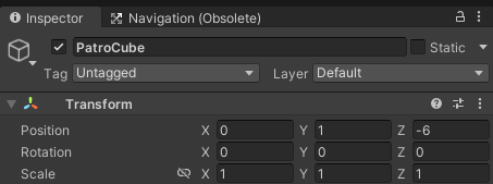 Nav Mesh Obstacle 컴포넌트를 추가하고 설정을 체크한다. PatroCube 오브젝트가 머무는 위치가 이동할 수 없는 경로 표현되는 것이 확인된다.