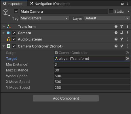 작성한 스크립트를 컴포넌트로 등록하고 player 오브젝트를 target으로 등록한다. 그러면 player가 움직일 때 카메라가 쫓아다니는 것을 확인할 수 있다.