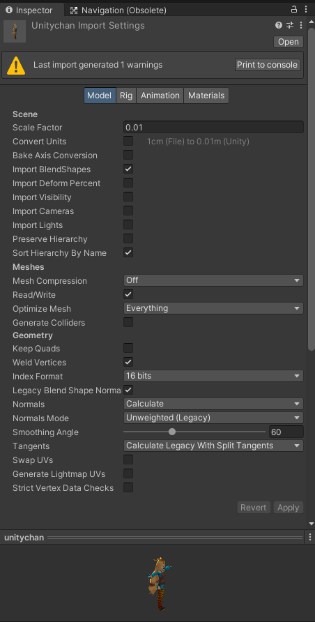 - 광원과 카메라 임포트 여부, 모델 크기 등 씬과 관련된 옵션 설정