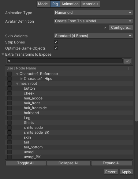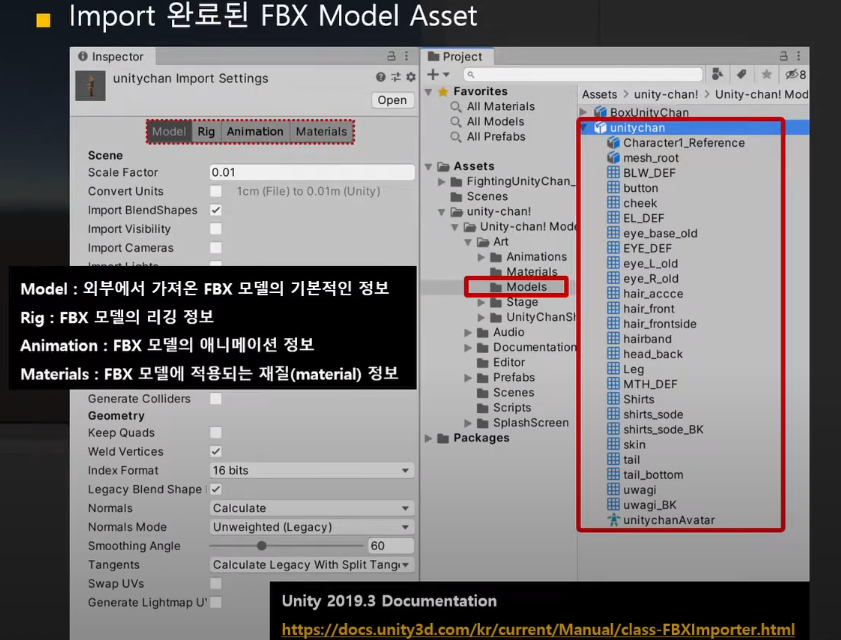 외부에서 가져온 FBX Model Asset은 Model, Rig, Animation, Materials 4개의 tab 정보를 설정하고 이를 통해 여러 요소들을 게임에 활용하게 된다.