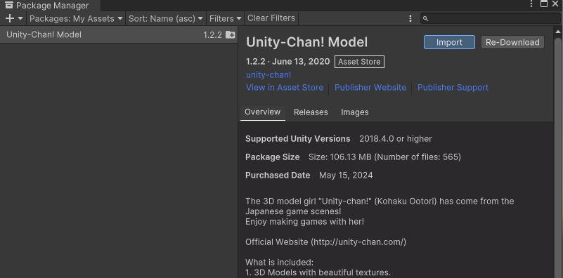 에셋을 추가하면 package manager에서 다운로드 후 프로젝트 뷰에 임포트 할 수 있다.