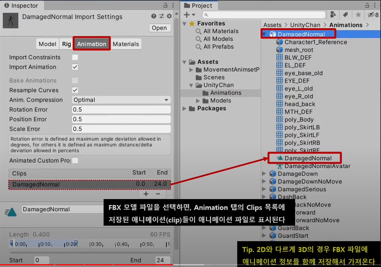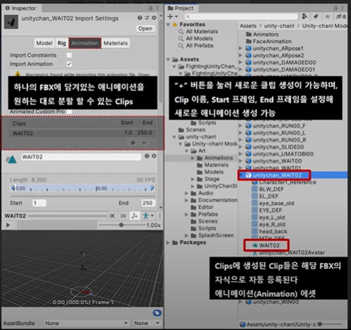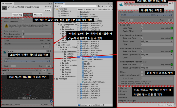 하나의 FBX에 여러 동작이 담겨있을 떄 동작을 나누는 clips, Clip 정보, 미리보기가 있다.