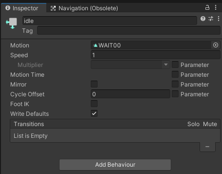 Animator View를 열고 create state > empty로 idle이라는 상태를 만든다. 이후 Motion에 WAIT00 애니메이션을 등록한다.