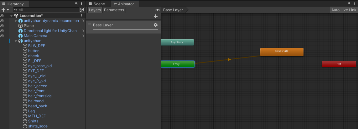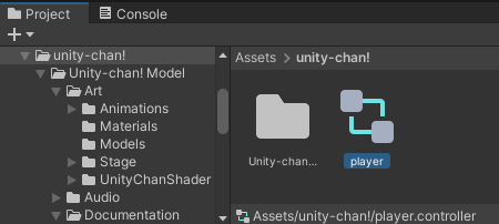 player라는 애니메이터 컨트롤러를 생성한 뒤 unitychan에 애니메이터 컨트롤러를 등록한다.
