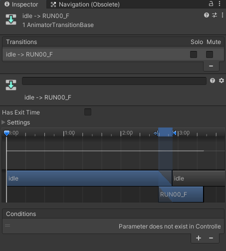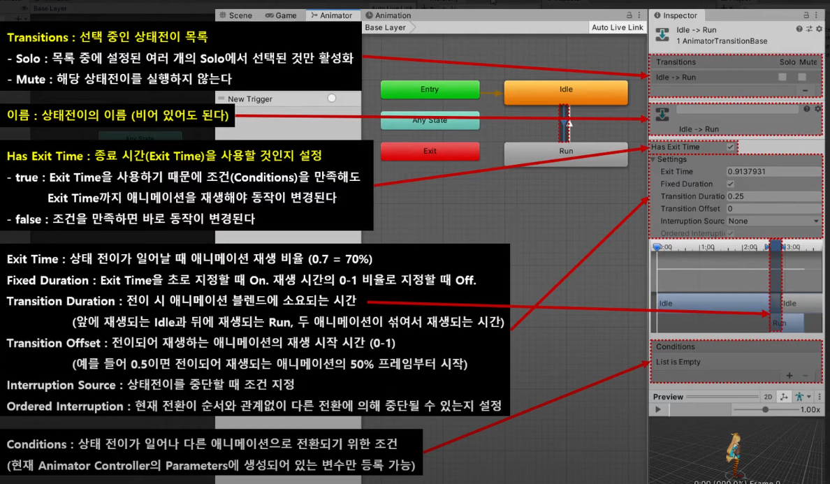 Make Transition으로 상태전이를 설정할 수 있으며 화살표가 상태 전이를 나타낸다. 화살표의 진행 방향으로만 애니메이션 전환이 가능하며 조건을 설정하지 않는 경우 애니메이션 1회 재생후 자동으로 애니메이션이 전환된다.