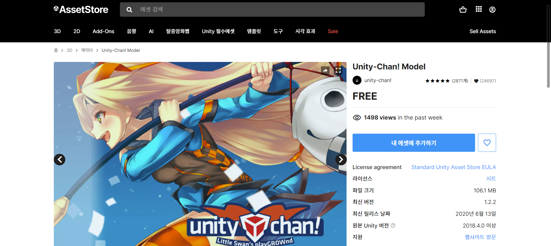이번 실습에서 사용하는 3D FBX 파일은 Asset Store에서 "Unity-Chan! Model" 검색 후 사용한다.