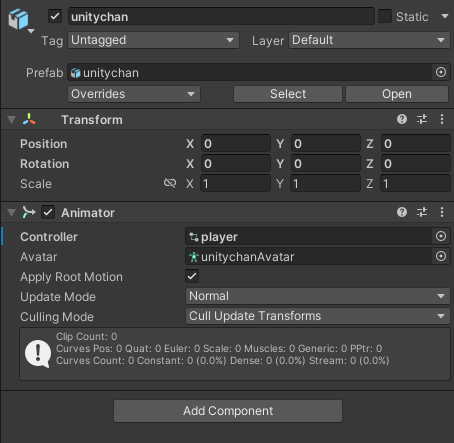 설정 완료된 애니메이션 컨트롤러와 아바타 마스크를 컴포넌트로 사용되는 애니메이터 컨포넌트에 등록하게 된다.