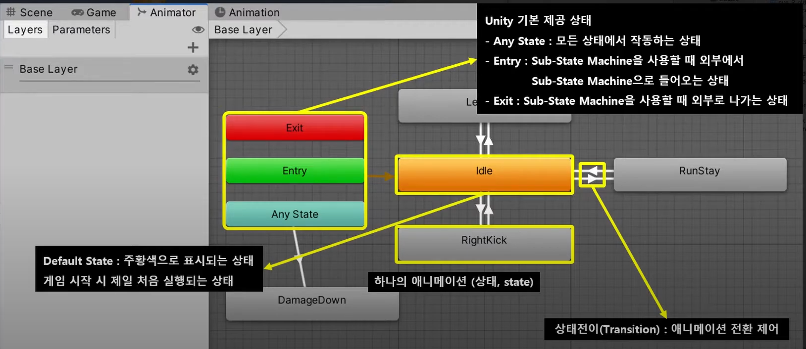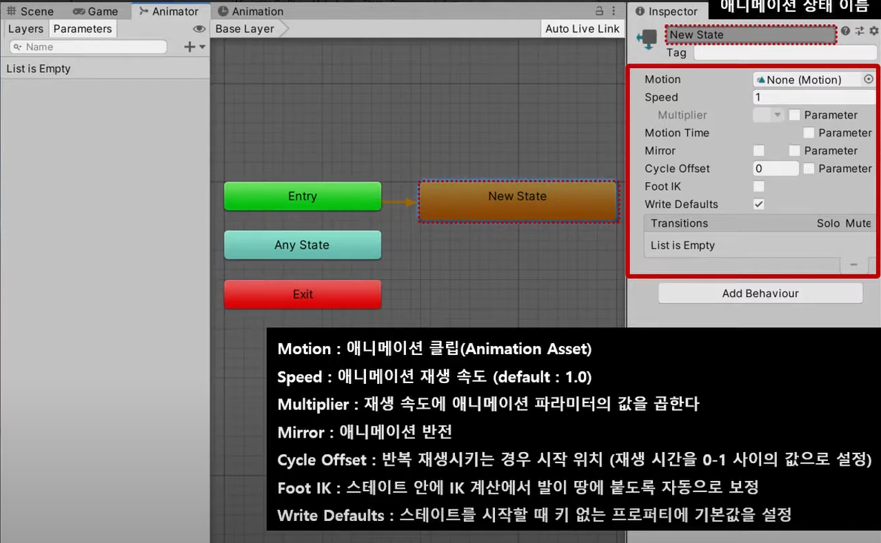 하나의 애니메이션 동작에 대한 설정(걷기, 왼손을 휘둘러 공격, 점프 대기 등)을 할 수 있다.