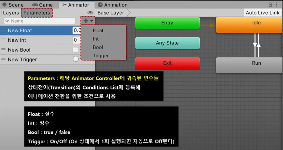파라미터를 생성하여 상태 전이의 컨디션을 리스트에 등록해 애니메이션 전환을 위한 조건으로 사용된다.