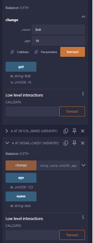 function change(string memory _name, uint256 _age) public {