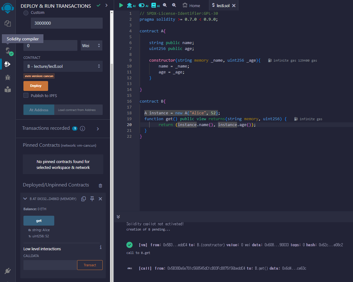 그리고 B 컨트랙에서 A 컨트랙의 인스터스화를 위하여 constructor 생성자에서 받아온 파라미터 값을 넣어준다. 각각 name과 age 변수는 "Alice" ,52로 입력받게 된다.
