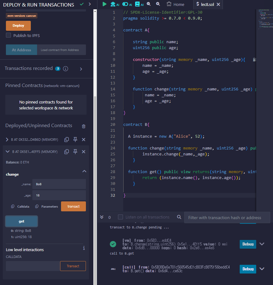 위의 예제에서 A 컨트랙에 change 함수를 정의하고 B 컨트랙에서는 A 컨트랙을 인스턴스화해서 change함수에 접근한다. 사용자에게 입력을 받고 파라미터 값들을 바꿀 수 있다.